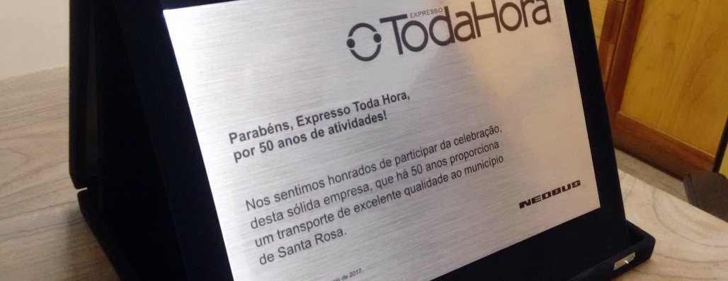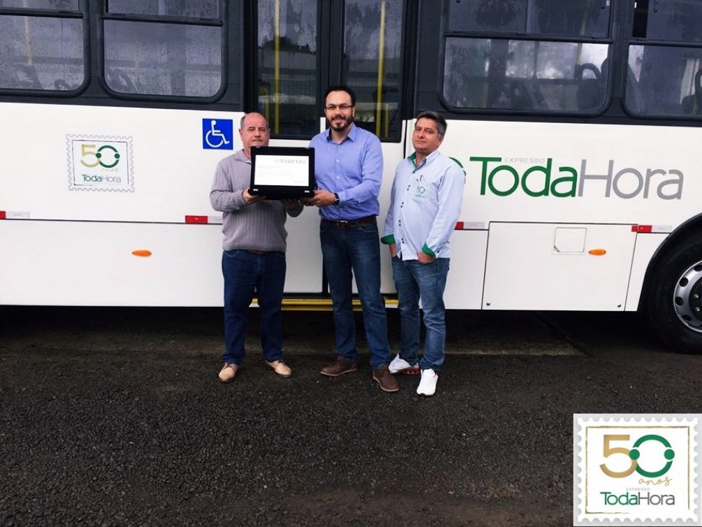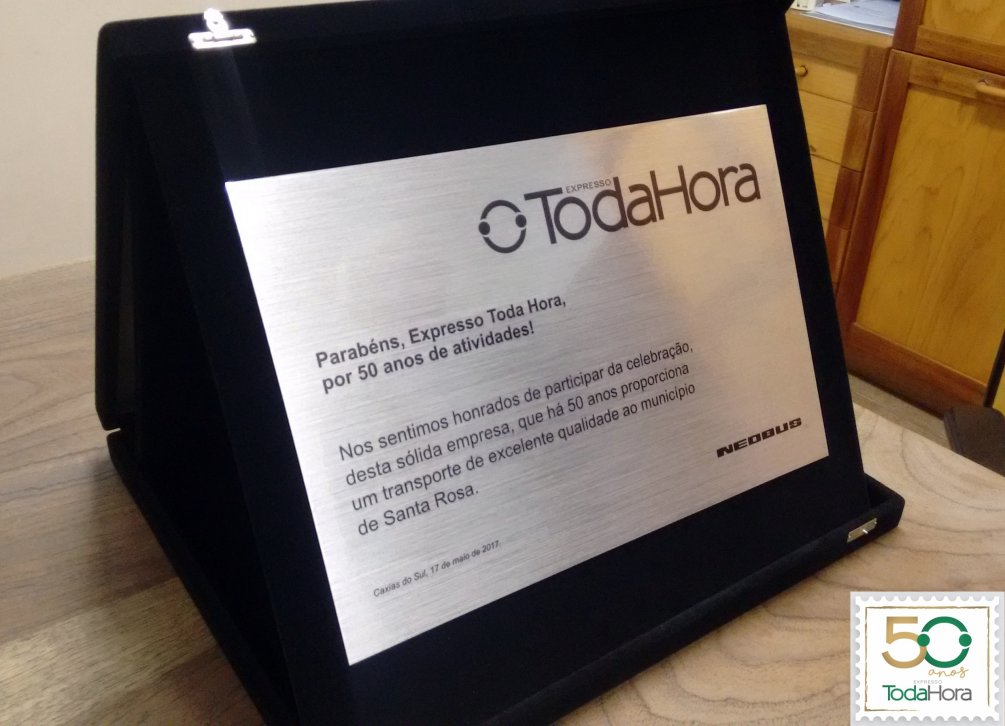 No dia 18/05/2017 nós da Expresso Toda Hora LTDA. tivemos a imensa alegria de receber uma linda homenagem de nossos parceiros de jornada da NEOBUS, que representados pelo amigo Volnei, nos entregaram uma placa em homenagem aos nossos 50 anos de História.