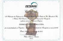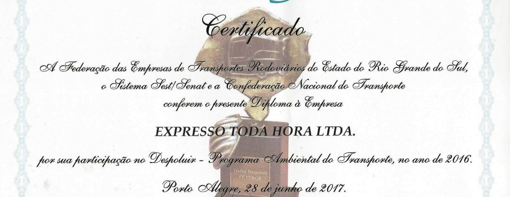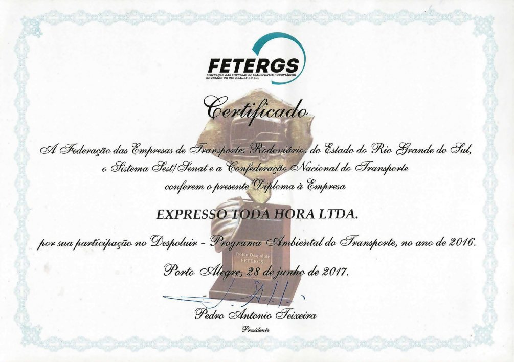 A Expresso Toda Hora LTDA., apresenta com orgulho o certificado concedido pela FETERGS, Sest/Senat e a Confederação Nacional do Transporte pela participação e aprovação de nossa empresa no Despoluir – Programa Ambiental do Transporte, deste ano.