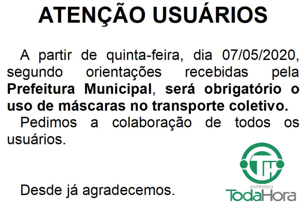 A partir de quinta-feira, dia 07/05/2020, segundo orientações recebidas pela Prefeitura Municipal, será obrigatório o uso de máscaras no transporte coletivo.